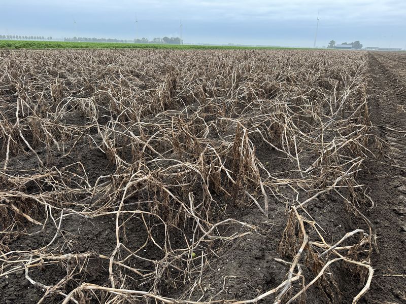 Tussendoor is er nog wel wat regen gevallen (ca. 30 mm in enkele dagen), waardoor het bij collega Kees wel wat natter was. Om de aardappels te rooien geen probleem. Nu kwam er wat klei om de aardappels heen, waardoor minder kans op beschadiging van de aardappelen.