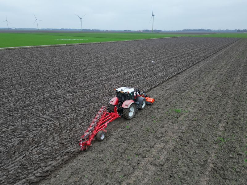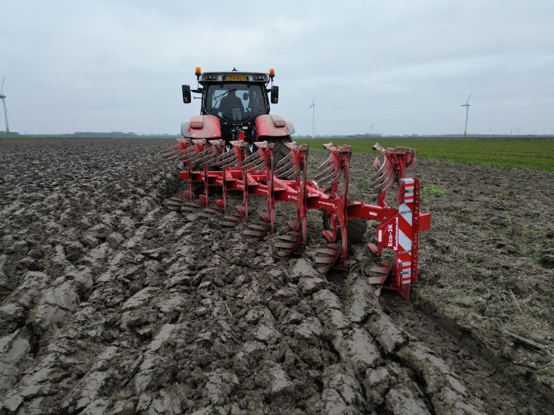 We ploegen sinds vorig jaar met de Koeckhoven 8 schaar ecoploeg. Dat wil zeggen we ploegen niet meer in de voor maar bovenover. Voordeel minder bodemverdichting in de ploegzool. We ploegen minder diep. Met deze ploeg ca. 18 cm, met de vorige ploeg werd 25 cm diep geploegd. Door ondieper te ploegen blijft de organische stof van de gewas resten ook meer bovenin. Dat is weer goed voor het bodemleven.