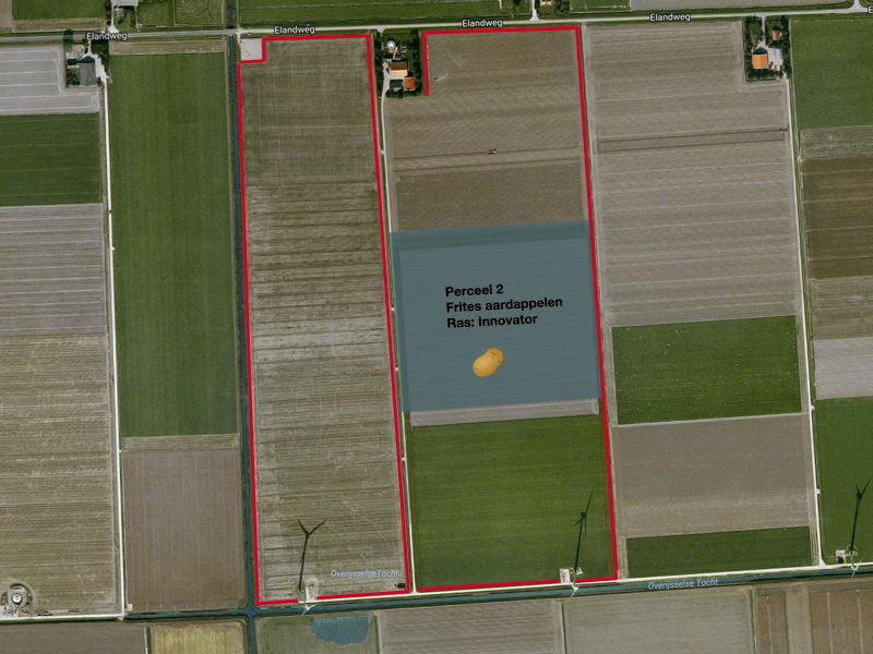 In 2026 wordt het ras Innovator gepoot. Het totale areaal aardappelen is ca. 9 ha. Voorvrucht is uien en zomertarwe. Het perceel is niet geploegd. Na de oogst van de uien is bladrammenas als groenbemester/tussengewas gezaaid. Na de oogst van de zomertarwe is een groenbemestermengsel met vlinderbloemigen, facelia, vlas etc. gezaaid.