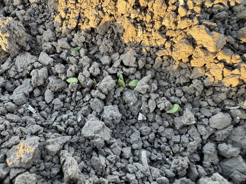 De eerste vlas komt boven. Een deel van het vlas ligt nog ongekiemd en een deel is net gekiemd. Het is aardig droog dus.